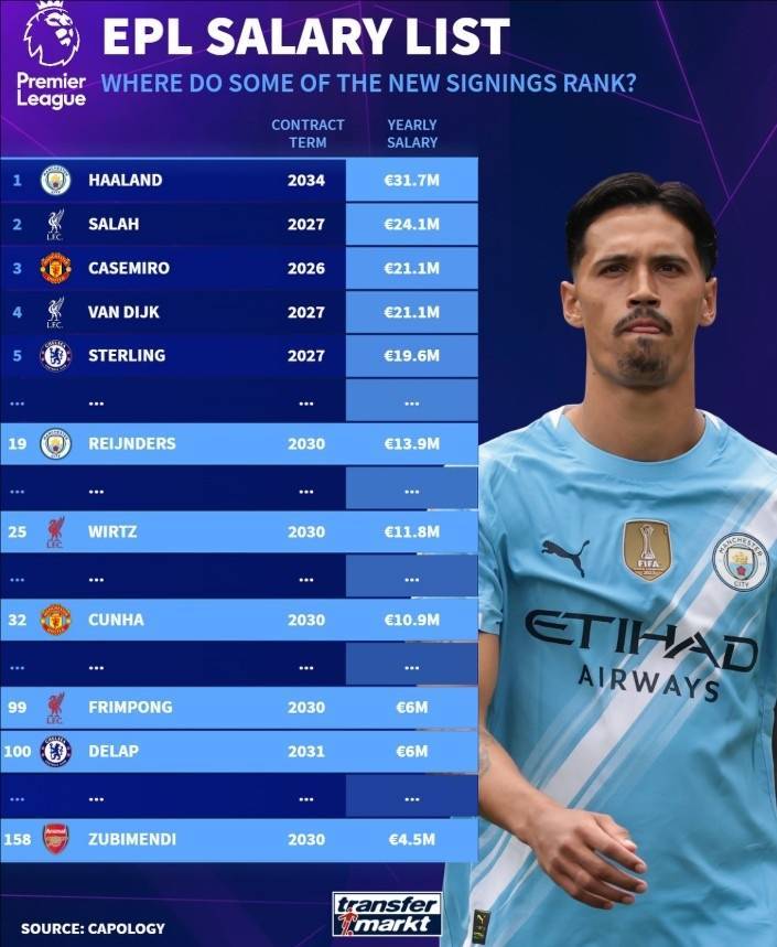 1.哈兰德(曼城)到2034年 年薪3170万欧
